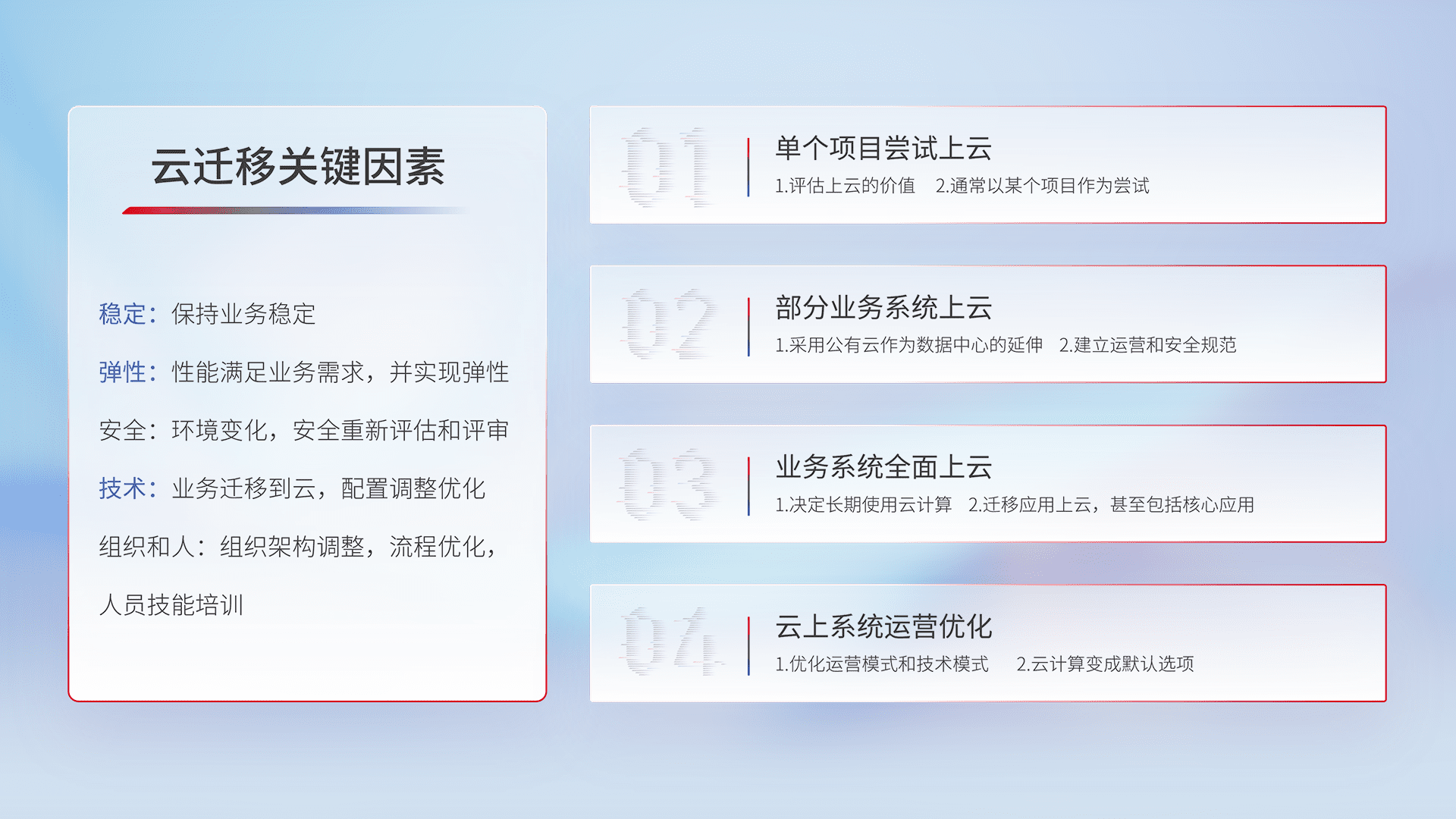 结合实际业务,,从规划设计、、、云平台选型、、云原生改造、、、数据迁移、、、、集成交付,,,,迁移全过程为客户识别最佳上云路径,,,做好风险识别管理,,,设计网络架构、、、、身份权限、、、安全审计合规、、、、操作审计、、、、日志审计、、、监控告警策略、、、、多站点容灾设计等,,,对云上基础设施进行整体规划,,,提升IT治理水平,,,以满足弹性、、、、高可用、、、、高性能的需求。。