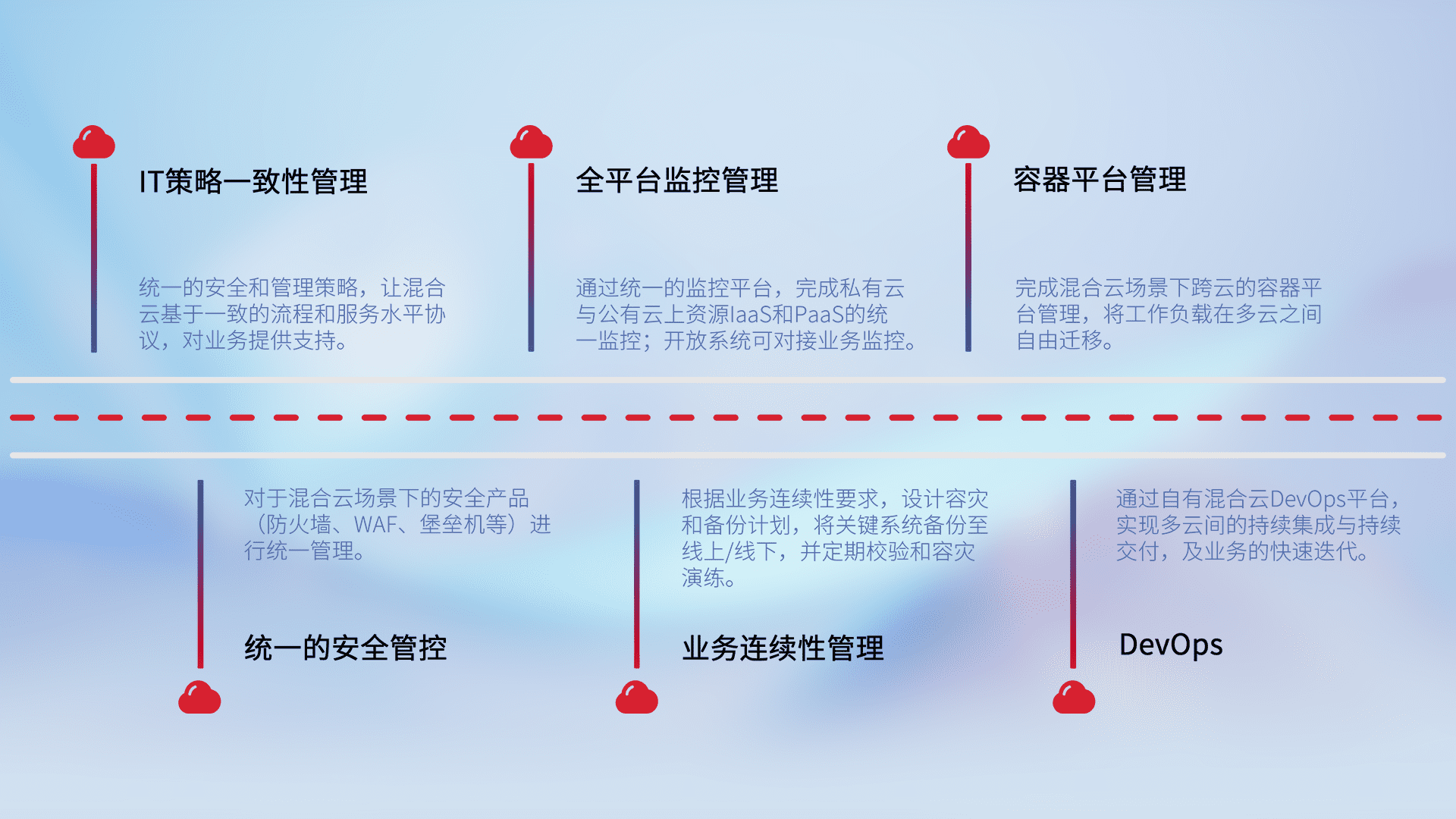 通过多云纳管,,以统一的资源数据模型把客户的云资源进行抽象和封装,,,进而实现对多云资源的统一操作,,,保障云资源管理的可靠性、、稳定性与可用性。。。。量身定制化运维内容,,,配置、、、开发运维、、、、补丁管理、、备份、、、、监控、、、认证和访问管理、、、审计和日常巡检等,,,,保障在用云过程中的可靠度,,,,稳定度以及高可用率。。