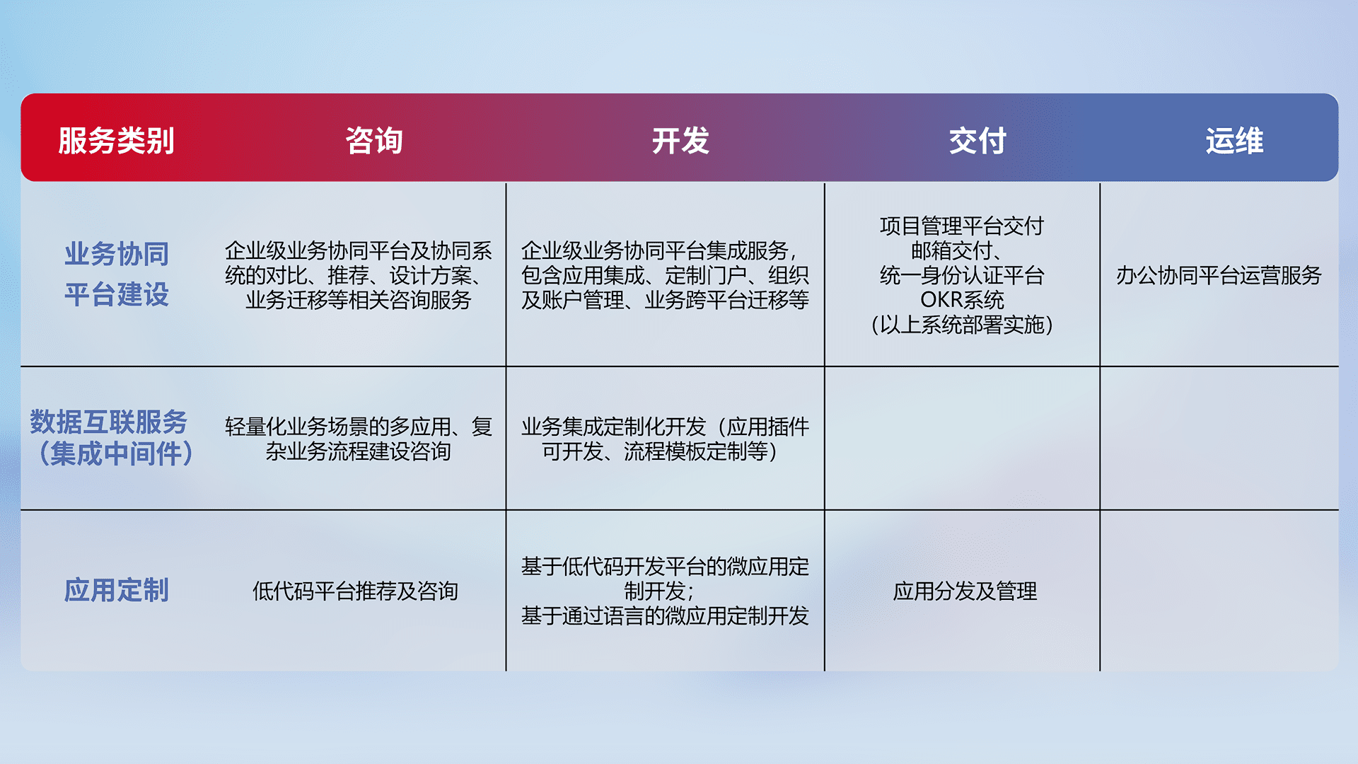 针对钉钉、、、企微、、IDaas等平台级产品提供产品的规划、、、方案、、交付、、定制化开发等服务,,实现如统一协同办公、、、智能客户服务、、、、混合会议管理、、、智能数据查询、、、、等业务场景,,,实现数字化转型。。。。